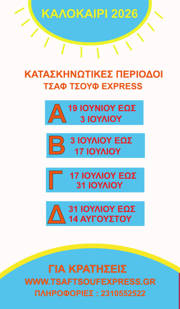 Ξεκινούν οι αιτήσεις Στελεχών για το καλοκαίρι του 2026. Αγαπημένοι μας φίλοι το 2026 έχει μπει και η κατασκήνωση Τσαφ Τσουφ Express προετοιμάζεται για να υποδεχθεί τους μικρούς της φίλους για ένα ακόμη καλοκαίρι. Ανοίγουν θέσεις εργασίας για ομαδάρχες, ομαδάρχισσες αλλά και θέσεις για τα επιμέρους